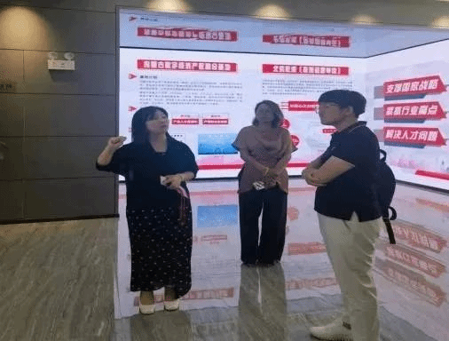在匠成教育科技有限公司,一行人参观了公司运营的大学生实习实训基地、数字技术展示与实践中心、大数据实训中心、双创实践孵化中心,全方位了解了企业在科技创新、人才培养、创业大赛孵化打磨等方面的校企合作软硬件环境。