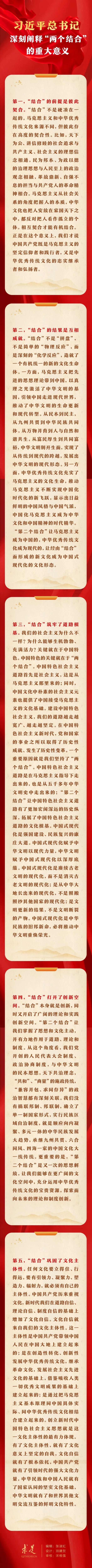 “在五千多年中华文明深厚基础上开辟和发展中国特色社会主义,把马克思主义基本原理同中国具体实际、同中华优秀传统文化相结合是必由之路。这是我们在探索中国特色社会主义道路中得出的规律性认识。”“‘第二个结合’,是我们党对马克思主义中国化时代化历史经验的深刻总结,是对中华文明发展规律的深刻把握,表明我们党对中国道路、理论、制度的认识达到了新高度,表明我们党的历史自信、文化自信达到了新高度,表明我们党在传承中华优秀传统文化中推进文化创新的自觉性达到了新高度。”