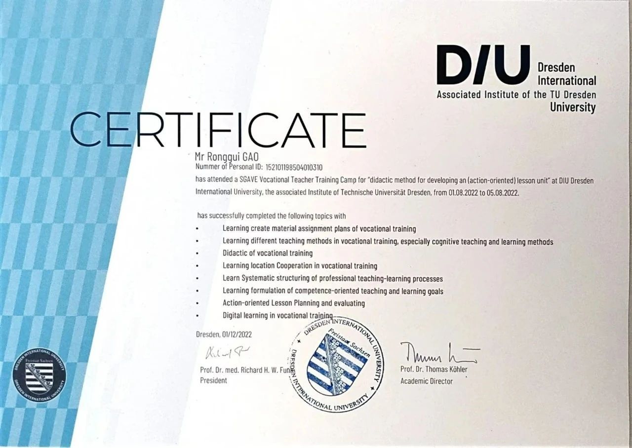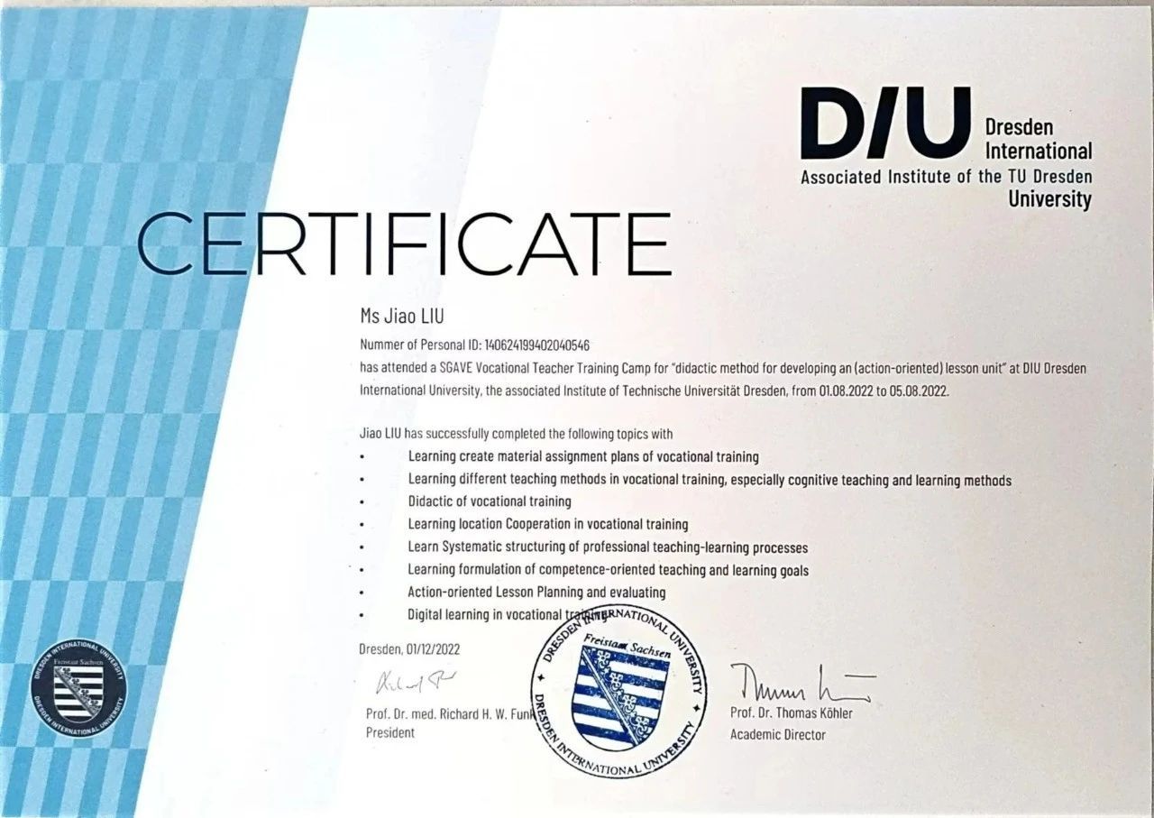 beat365大数据技术专业通过教育部中德先进职业教育(SGAVE)新一代信息技术领域项目评估组的实地考察和项目评估,2022年获批中德先进职业教育合作项目首批试点院校。经过调研、培训、人才培养方案的论证,大数据技术专业教学团队与SGAVE项目组根据大数据技术就业领域和职业岗位(群)的工作能力要求,参照职业资格标准和所应具备的职业能力和职业素质,遵循学生职业成长规律和可持续发展能力,构建了工作过程系统化的课程体系,开发了大数据技术专业的人才培养方案,6位教师获得了项目秘书处和国际合作机构颁发的培训证书。