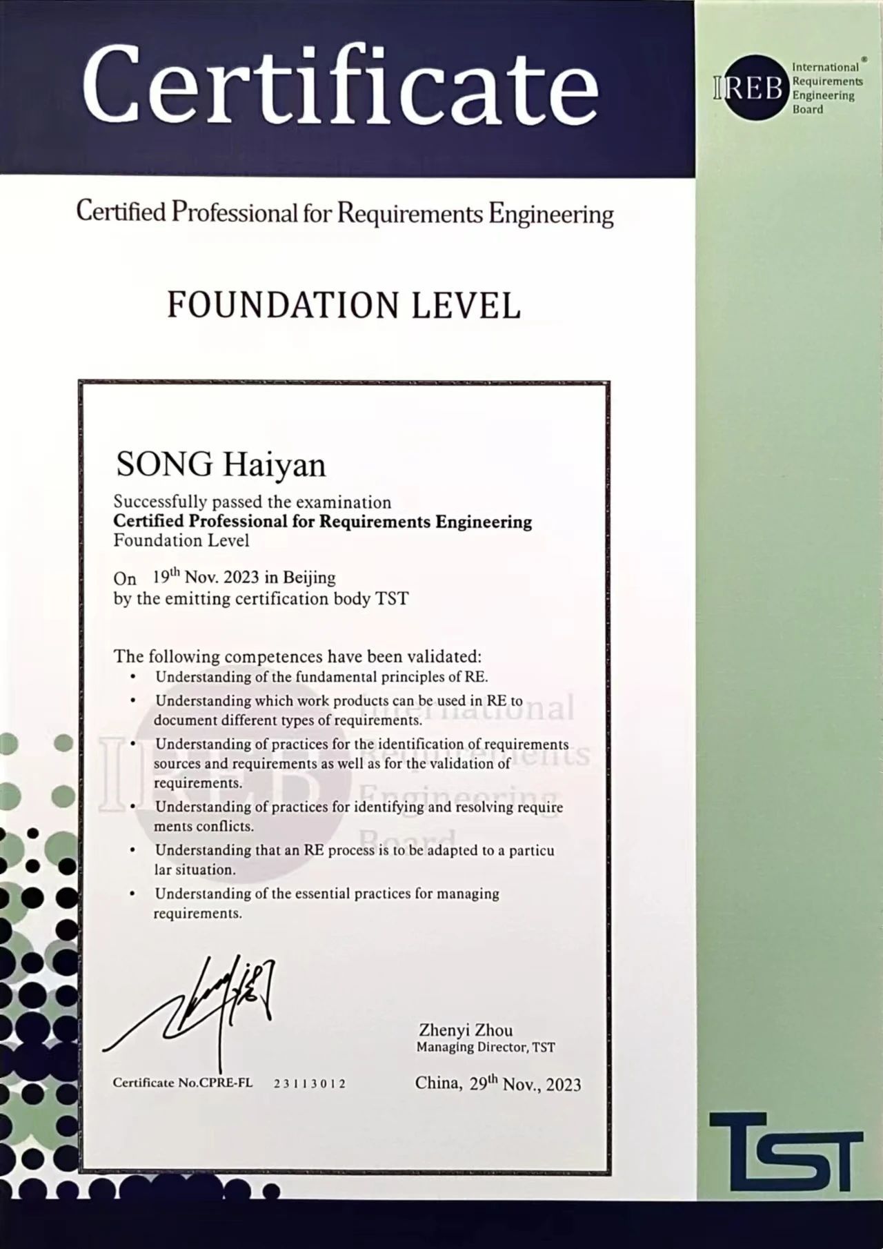 2023年11月19日,IREB CPRE国际需求工程师认证在北京举行,beat365作为教育部中德先进职业教育合作项目试点院校,选派赵祯和宋海燕两位老师参加基础级认证考试并全部通过。