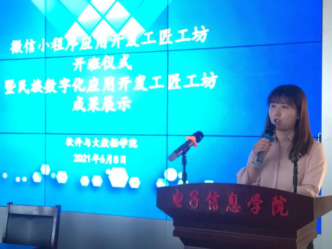 为进一步促进产教融合,校企合作,践行“理实一体 虚实结合 工匠工坊”的人才培养模式,6月8日下午,软件与大数据学院在实训楼D座5楼举办了“微信小程序应用开发工匠工坊”开班仪式暨“民族数字化应用开发工匠工坊”成果展示活动