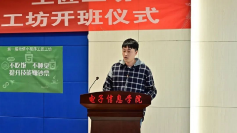 微信小程序工匠工坊校方教师代表杨东霞致辞,她首先感谢了学校及学院领导为学生们创造的这次来之不易的学习机会,保证自己会在没课的时间全程陪同工坊学生共同学习,同时希望学生们把握机会,努力学习。