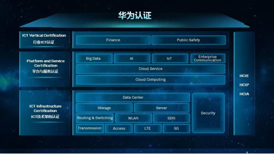 华为认证体系包含“ICT技术架构认证”、“平台与服务认证”、“行业ICT认证”三类技术领域人才标准。其中,ICT技术架构认证聚焦ICT基础软硬件设施,提供Data Center、Storage、Server(In progress)、Routing & Switching、WLAN、Security、SDN、Transmission、Access、LTE、5G 十一个技术方向的能力认证,培养具备基础设施规划、建设和维护能力的专业人才;平台与服务认证覆盖AI、IoT、Cloud等新技术领域,提供Cloud Computing、Cloud Service、Big Data、AI、IoT、Enterprise Communication 六个技术方向的认证,聚焦培养具备业务、技术、应用融合能力,能进行云平台架构、建设和运营,并在平台基础上进行新技术应用和开发创新的新型人才;行业ICT认证深入理解行业,提供Finance、Public Safety两个行业方向的认证,聚焦培养既懂技术,又懂行业的复合型人才。