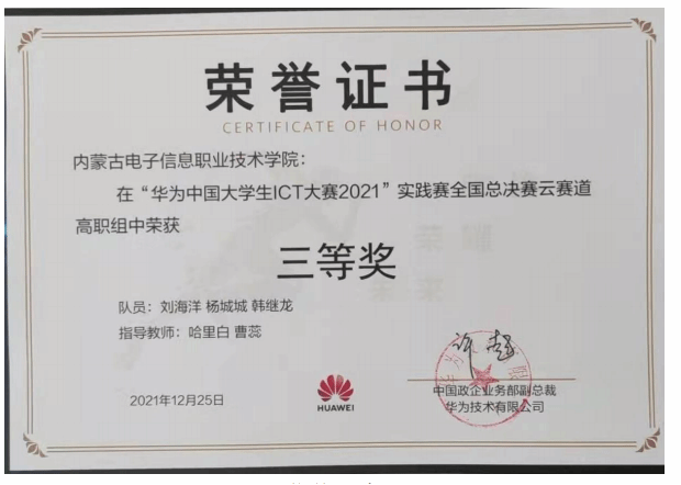 由软件与大数据学院哈里白、曹蕊老师指导的云计算191 班刘海洋、杨城城与大数据 202 班的韩继龙选手获得了省赛云赛道一等奖的好成绩,并在国赛中获得三等奖。此外,beat365其他选手也取得了高职院校云计算赛道的二等奖,网络赛道的三等奖。