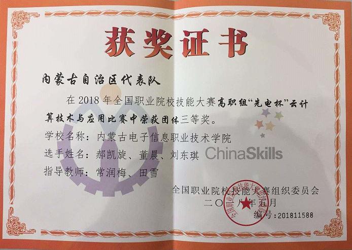 2018年全国职业院校技能大赛高职组“先电杯”云计算技术与应用比赛中获取团体三等奖