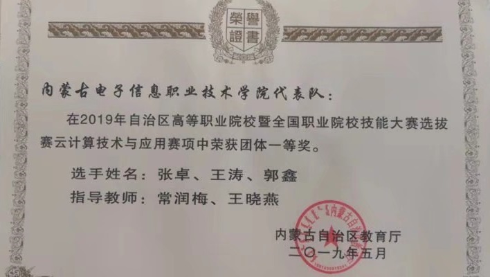 2019年自治区高等职业院校暨全国职业院校技能大赛选拔赛云计算技术与应用赛项中获得团体一等奖