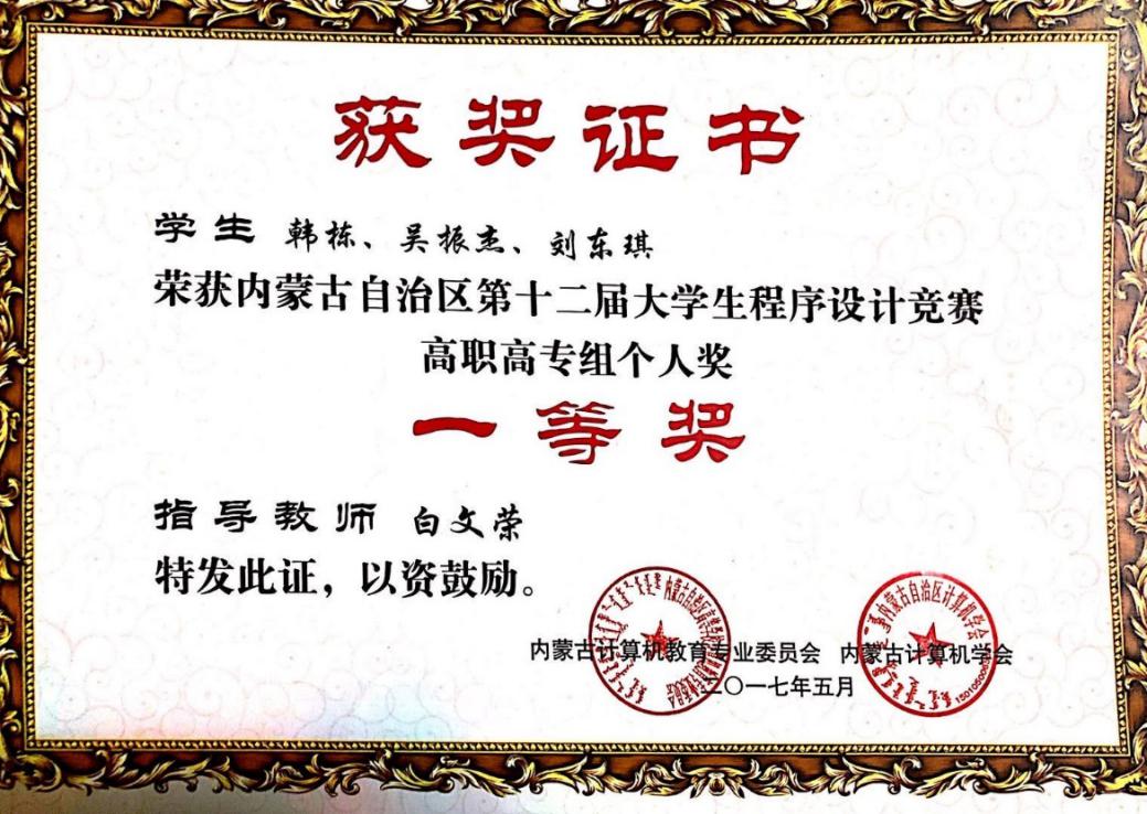 (2)技能大赛:内蒙古自治区第十二届大学生程序设计竞赛一等奖 ;蓝桥杯全国软件和信息技术专业人才大赛内蒙古赛区一等奖;华北五省“联想杯”大学生计算机应用大赛内蒙古赛区选拔赛高职组二等奖;“中慧杯”全国高等职业院校Web应用软件开发技能竞赛三等奖。