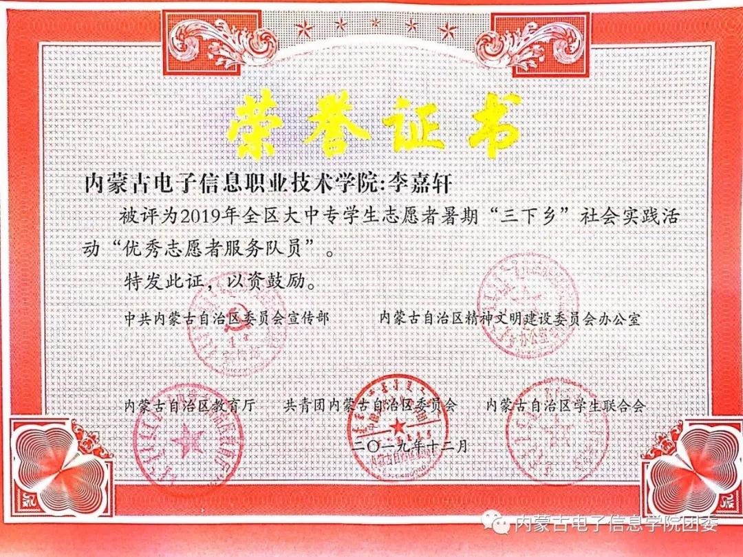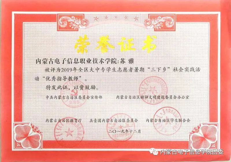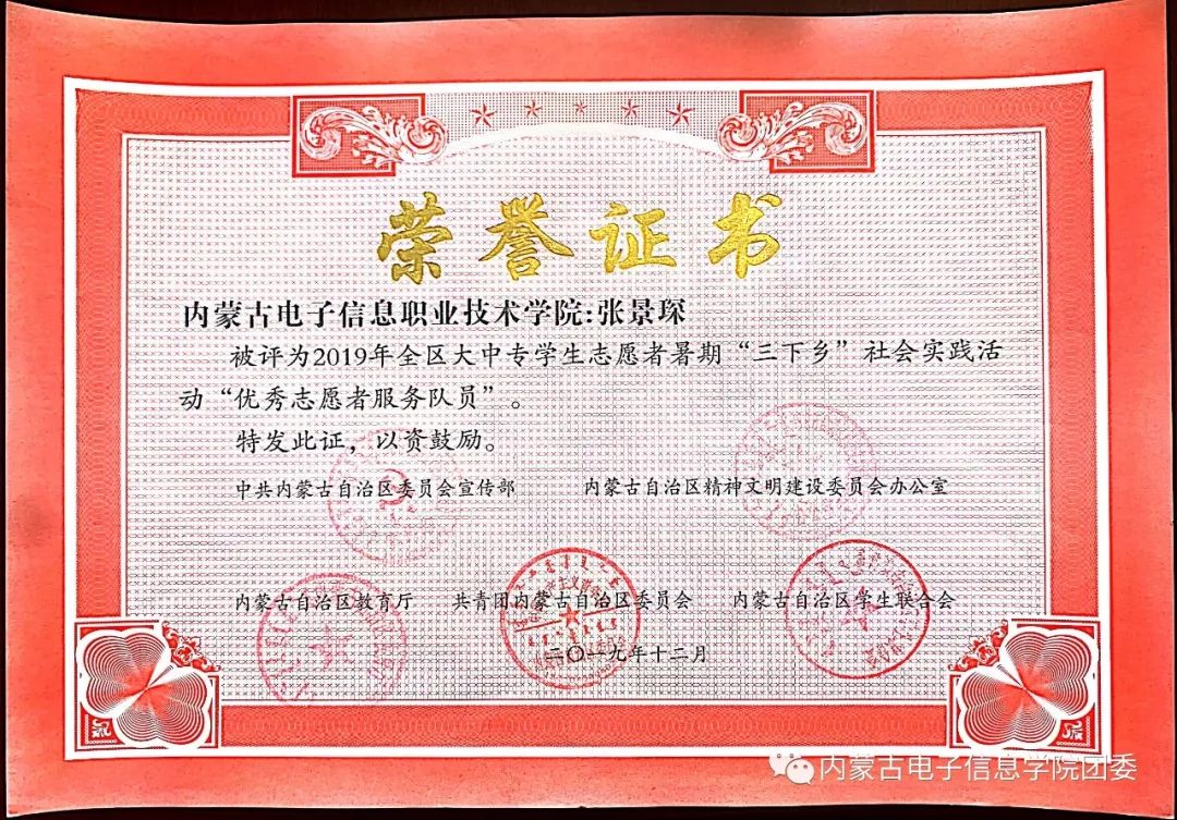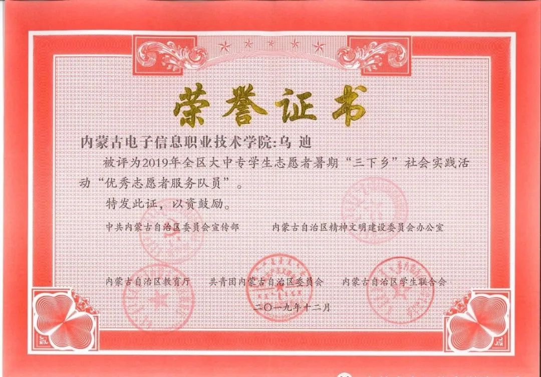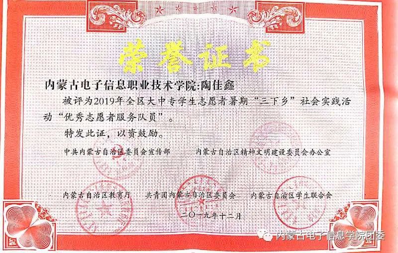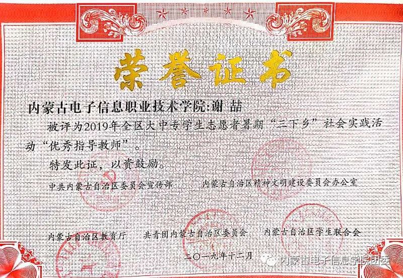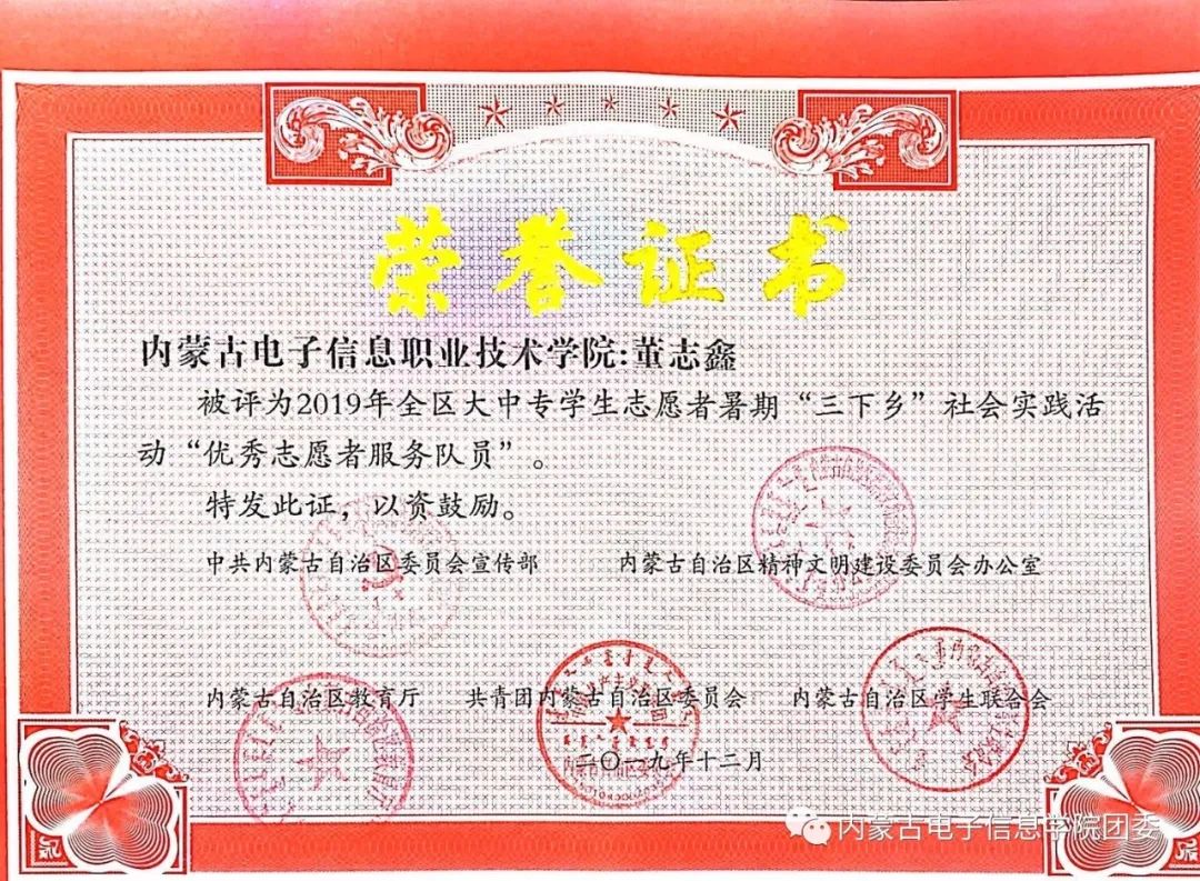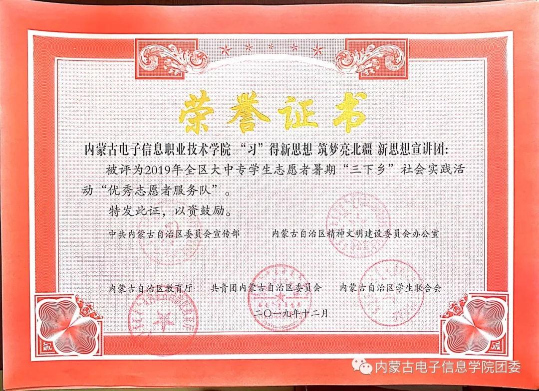 近期,自治区党委宣传部、文明办、教育厅、团委、学联决定联合下发了《关于表彰2019年全区大中专学生志愿者暑期“三下乡”社会实践先进集体和优秀个人的决定》,其中,beat365喜获“优秀组织奖”;校团委直属团队“‘习’得新思想筑梦亮北疆”新思想宣讲团荣获“优秀志愿者服务队”荣誉称号;高伊娜、苏雅、谢喆老师分获“优秀工作者”“优秀指导教师”荣誉称号;李新、张景琛、吴彤、乌迪、董志鑫、张泽鹏、李嘉轩、陶佳鑫等8名同学均获得“优秀志愿者服务队员”荣誉称号。