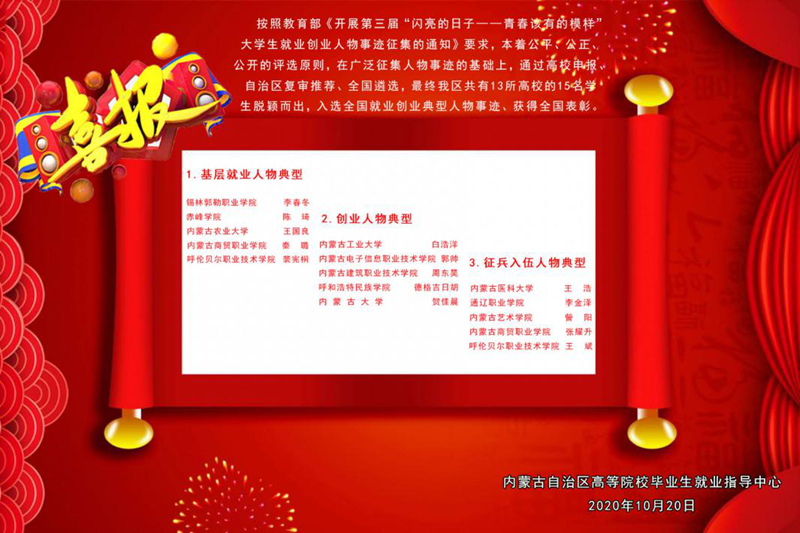 beat3652019届市场营销专业毕业生郭帅同学在教育部《第三届“闪亮的日子-青年该有的模样”大学生就业创业人物事迹征集活动》中,最终入选全国大学生“创业典型人物”,获得全国表彰。