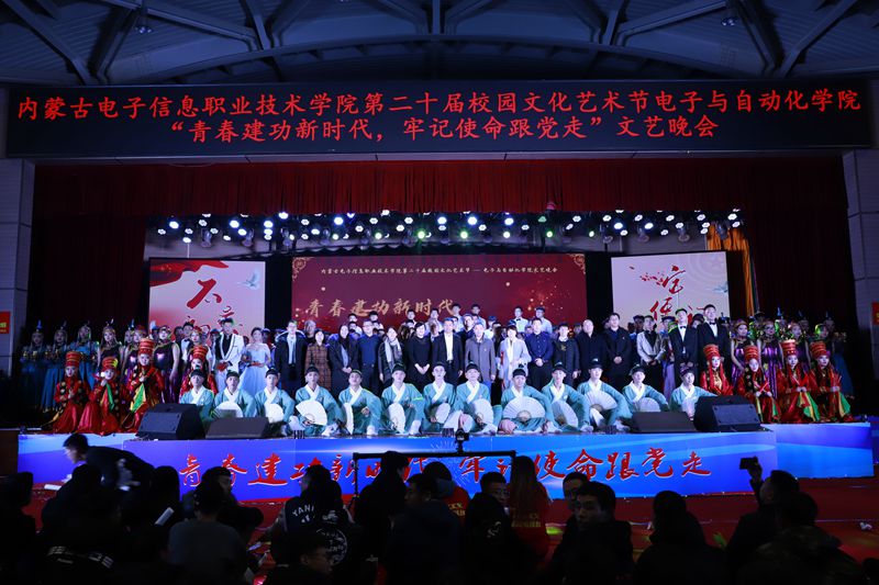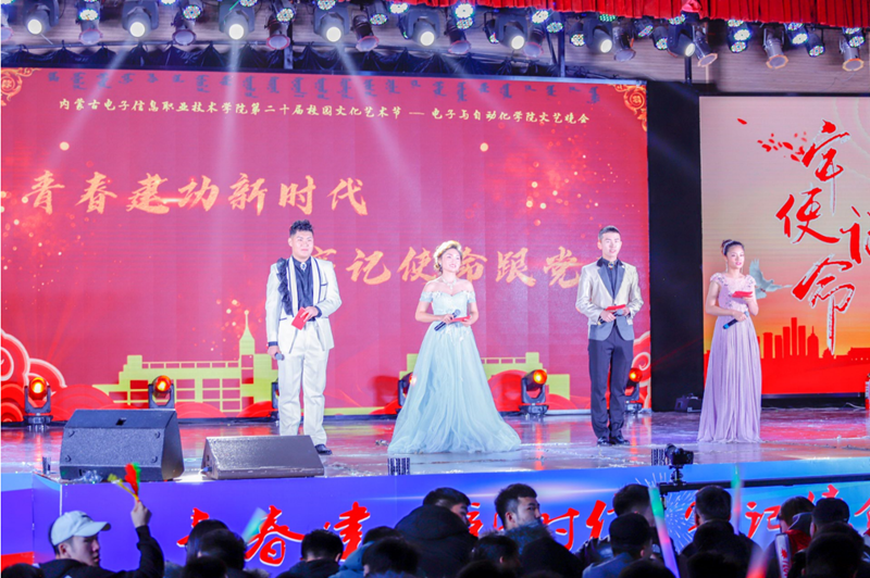 晚七点整,文艺晚会隆重开幕。内蒙古创维智能科技有限公司总经理刘丽丽、经理白音那、管心亮、主任孟永茂及内蒙古金开信息技术有限公司总经理王成刚,呼和浩特市五环信元科技有限公司总经理高维伟,副总经理张晓,广东省电信规划设计院有限公司分院院长熊寿明、副院长秦敏,内蒙古马哈鱼科技有限公司总经理谢馨、法人代表赵勃、经理东升,校党委委员、宣传部部长李占岭,电子与自动化学院党总支书记胡玮,院长刘占伟,校团委书记刘泽利,软件与大数据学院党总支副书记杨志敏,数媒与艺术设计学院党总支副书记张志海,电子与自动化学院党总支副书记石磊,电子与自动化学院副院长袁文博,副院长周俭,以及学院全体教师参加了本次艺术节活动。