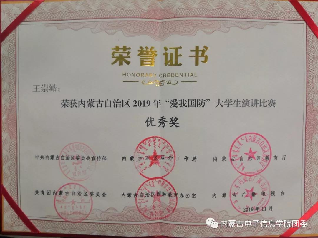 自治区国防教育办公室组织开展的“爱我国防”大学生演讲比赛分为东部、中部、西部三个赛区。经过校园初选、盟市推荐,beat365电子与自动化学院2018级王崇澔同学顺利进入赛区复赛,经过多个环节的激烈角逐,荣获内蒙古自治区“爱我国防”大学生演讲比赛优秀奖。