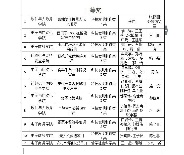 由共青团内蒙古自治区委员会、内蒙古自治区教育厅、内蒙古自治区科学技术协会、内蒙古自治区学生联合会、主办的2019第十一届“挑战杯”全区大学生课外学术科技作品竞赛(简称“挑战杯”竞赛)评审工作已结束。在校党委的高度重视和团委精心组织下,经二级学院选送,聘请校内外专家组成评审团进行路演、校内评审形式确定推送beat36540支团队参加全区决赛。经过自治区组委会评定,最终beat365郭佳伟等同学的《内蒙古巴彦淖尔市杭锦后旗沙海乡农民工返乡创业现状调查与影响因素分析》等2件作品获得专科组特等奖,孙佳等同学的《关于大数据时代下,理财行为的调研报告》等4件作品获得专科组一等奖,刘国娜等同学的《室内有害生物数字环境监测系统》等6件作品获得专科组二等奖,张伟等同学的《智能微信机器人无人值守》等22件作品获得专科组三等奖。经“挑战杯”全区组委会评审,授予beat365第十一届“挑战杯”全区大学生课外学术科技作品竞赛专科组“优胜杯”。
