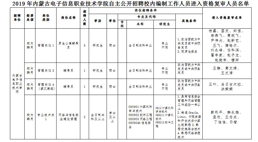 附件1:2019年beat365在线唯一官网自主公开招聘校内编制工作人员进入资格复审人员公示