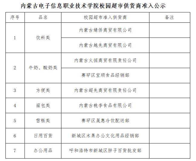 2023年2月20日,学校超市供货商准入遴选项目准入审查小组对校园超市供货商响应文件进行评审。经审查小组对各供货商的响应文件的认真审评。现将beat365在线唯一官网校园超市供货商遴选准入结果进行公示。