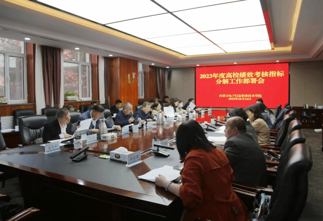 10月16日下午,学校在会议中心二号会议室召开了2023年度高校绩效考核指标分解工作部署会。学校党委副书记、校长王生铁主持会议。党委委员、副校长郑志丽、恩和门德,各单位(部门)主要负责人,各二级学院党总支书记、院长参加会议。