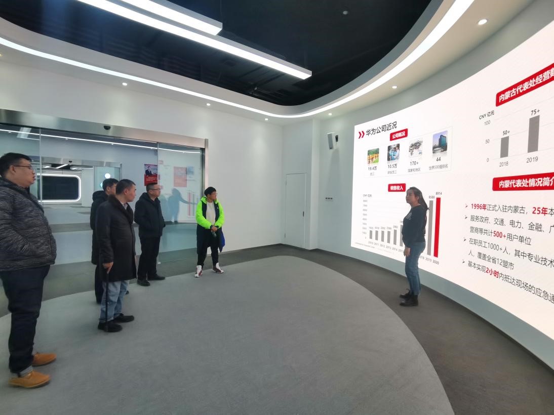 下午,秦婷一行首先参观了华为公司内蒙古和林格尔展厅。企业负责人介绍了华为运营商业务、政企业务、消费者业务等业务布局和战略,一行人详细了解了华为政务云、软件开发云、城市智能体、华为ICT培训、华为无人驾驶、华为矿山智能系统等。