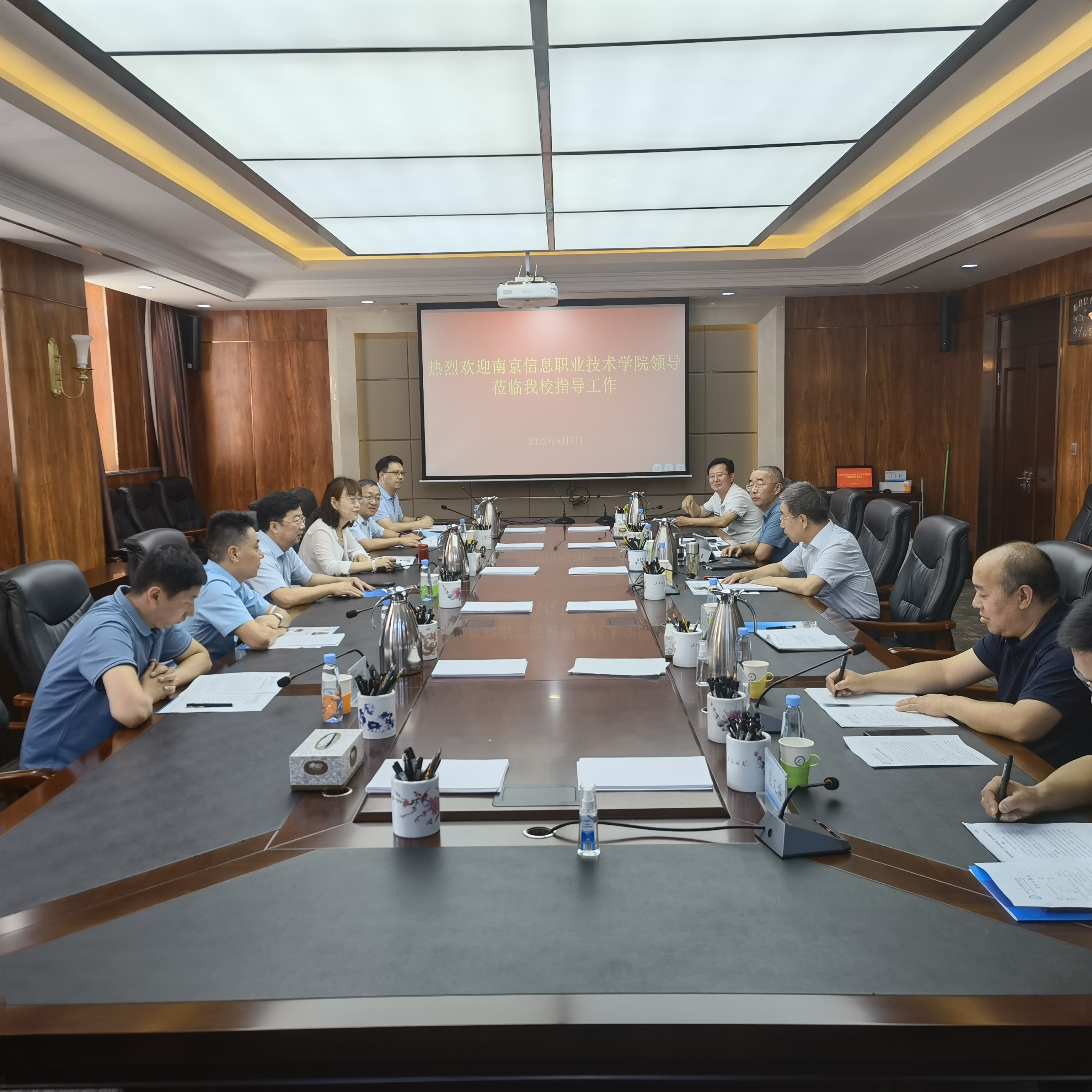 8月7日上午9:30,南京信息职业技术学院校长田敏,党委委员、副校长徐建俊一行7人来校调研。学校党委副书记、校长王生铁,党委委员、副校长恩和门德出席并会谈。党政办公室、科技处、校企合作与社会服务中心等相关部门负责人参加座谈。