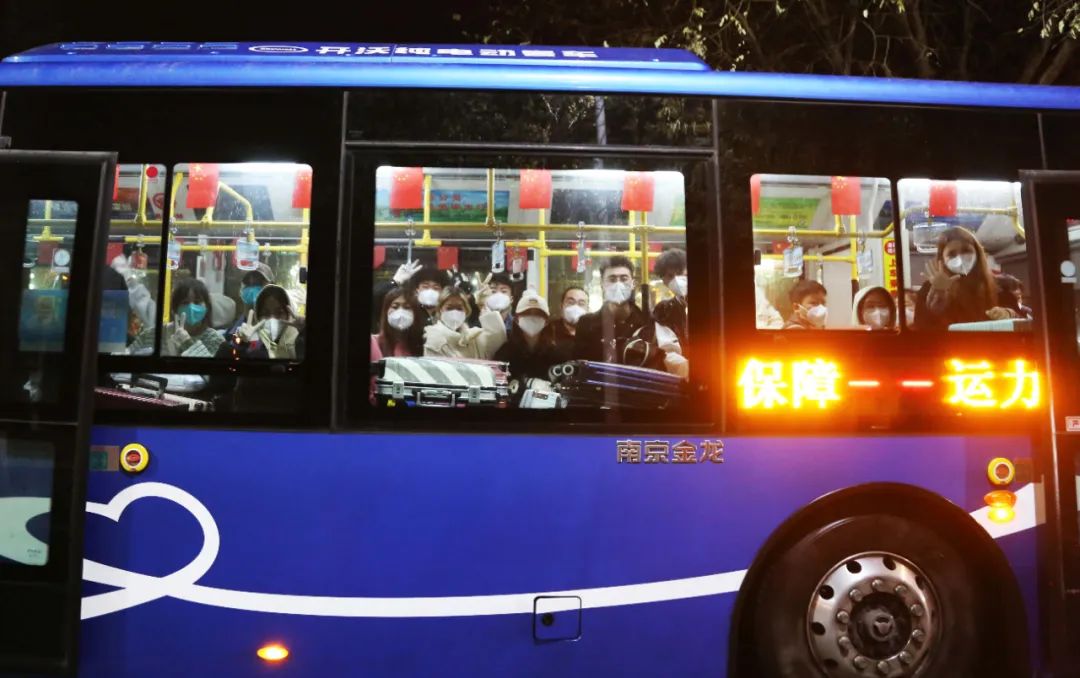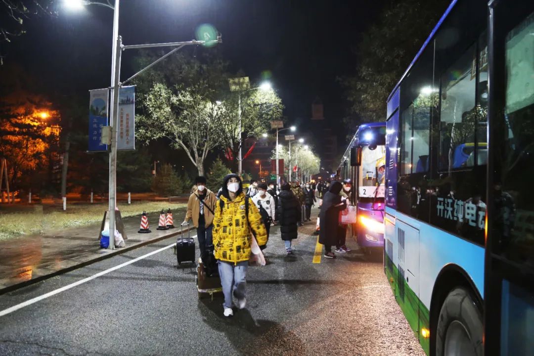 凌晨3点的校园热闹起来,学校党委书记李春燕,党委副书记、校长王生铁现场指挥,核对信息、沟通对接、确定车辆、协调转运.老师们彻夜不眠的忙碌,迎来了同学们的整装待发。怀揣着对学生的牵挂,老师们热泪盈眶,与你挥手告别,只愿护你平安返乡。