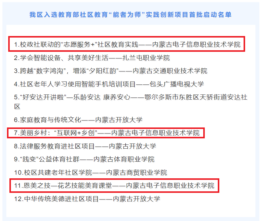 据报道,按照教育部《关于开展社区教育“能者为师”特色课程推介共享行动的通知》《关于组织开展“智慧助老”优质工作案例、教育培训项目及课程资源推介工作的通知》统一部署,内蒙古自治区大力推动“智慧助老”“能者为师”推介共享活动,精心组织、广泛发动,明确目标、落实责任。经过努力,全区共有12个推荐项目入选教育部社区教育“能者为师”实践创新项目首批启动名单,3个项目入选教育部“智慧助老”优质工作案例、教育培训项目及课程资源首批推介名单,开发开放数字化学习资源,全力服务全民终身学习。